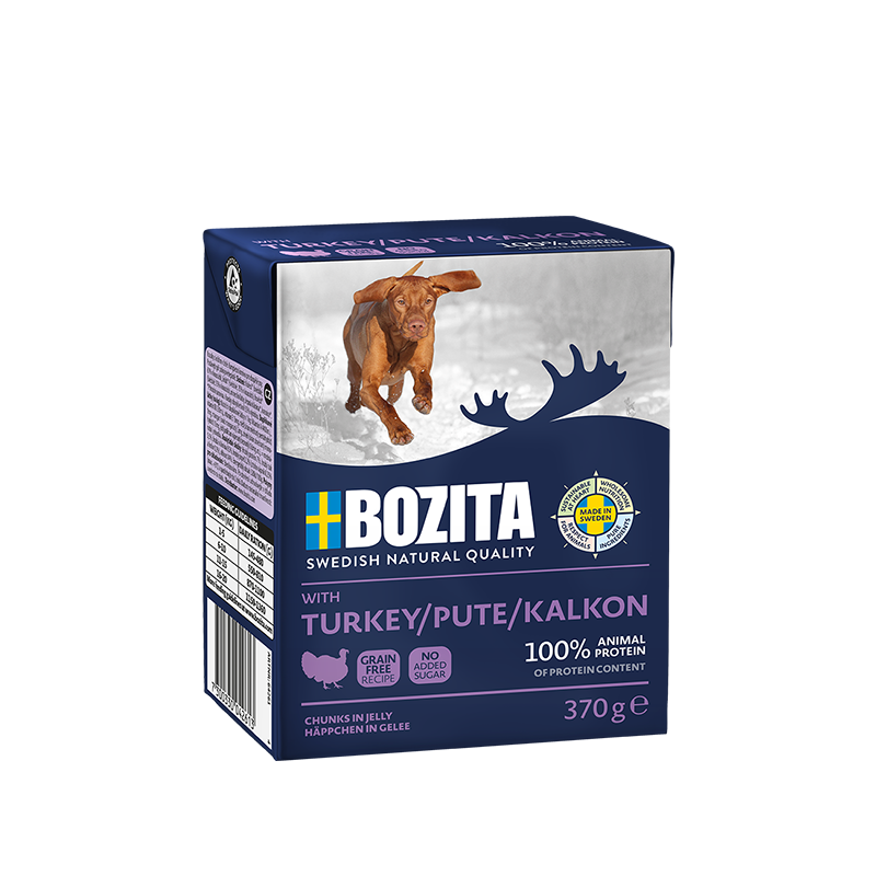 Kawałki w galaretce z indykiem. Pełnoporcjowa karma dla psów. Podawać w temperaturze pokojowej.