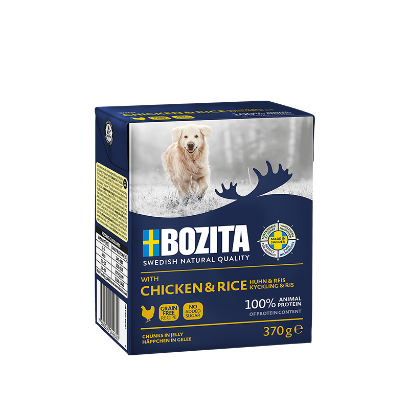 Kawałki w galaretce z kurczakiem i ryżem. Pełnoporcjowa karma dla psów. Podawać w temperaturze pokojowej.