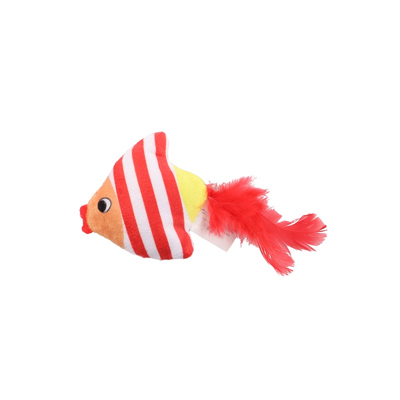 Pluszowa zabawka dla kotów w kształcie rybki z puchatym ogonkiem wykonanym z piór! Posiada wypełnieni z kocimiętki.