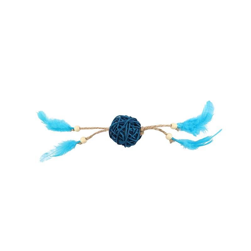 Zabawka dla kotów w kształcie piłeczki, wykonana z wikliny, naturalnych sznurków, drewnianych koralików oraz piór. Zawiera dzwoneczek.