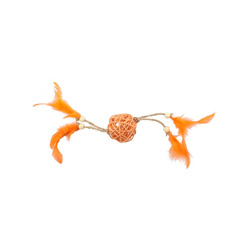 Zabawka dla kotów w kształcie piłeczki, wykonana z wikliny, naturalnych sznurków, drewnianych koralików oraz piór. Zawiera dzwoneczek.