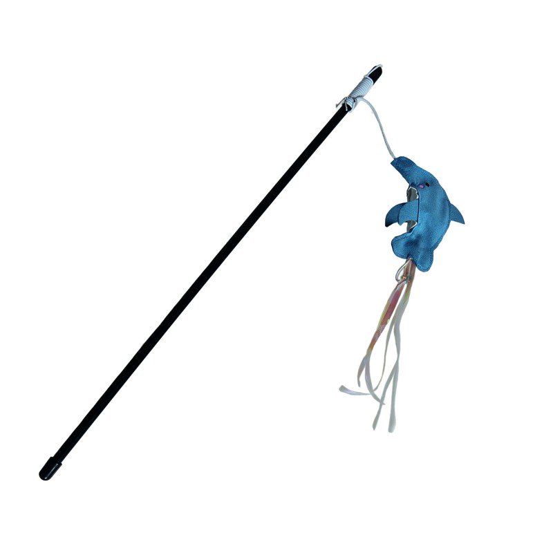 Wędka z delfinkiem, wstążkami i dzwoneczkiem – ta zabawka przyciągnie uwagę Twojego kota i rozbudzi jego chęć do zabawy, zapewniając mu mnóstwo radości.