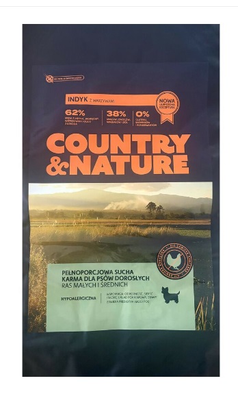 Karma COUNTRY&NATURE Indyk z Warzywami to pełnoporcjowa sucha karma dla psów dorosłych ras małych.