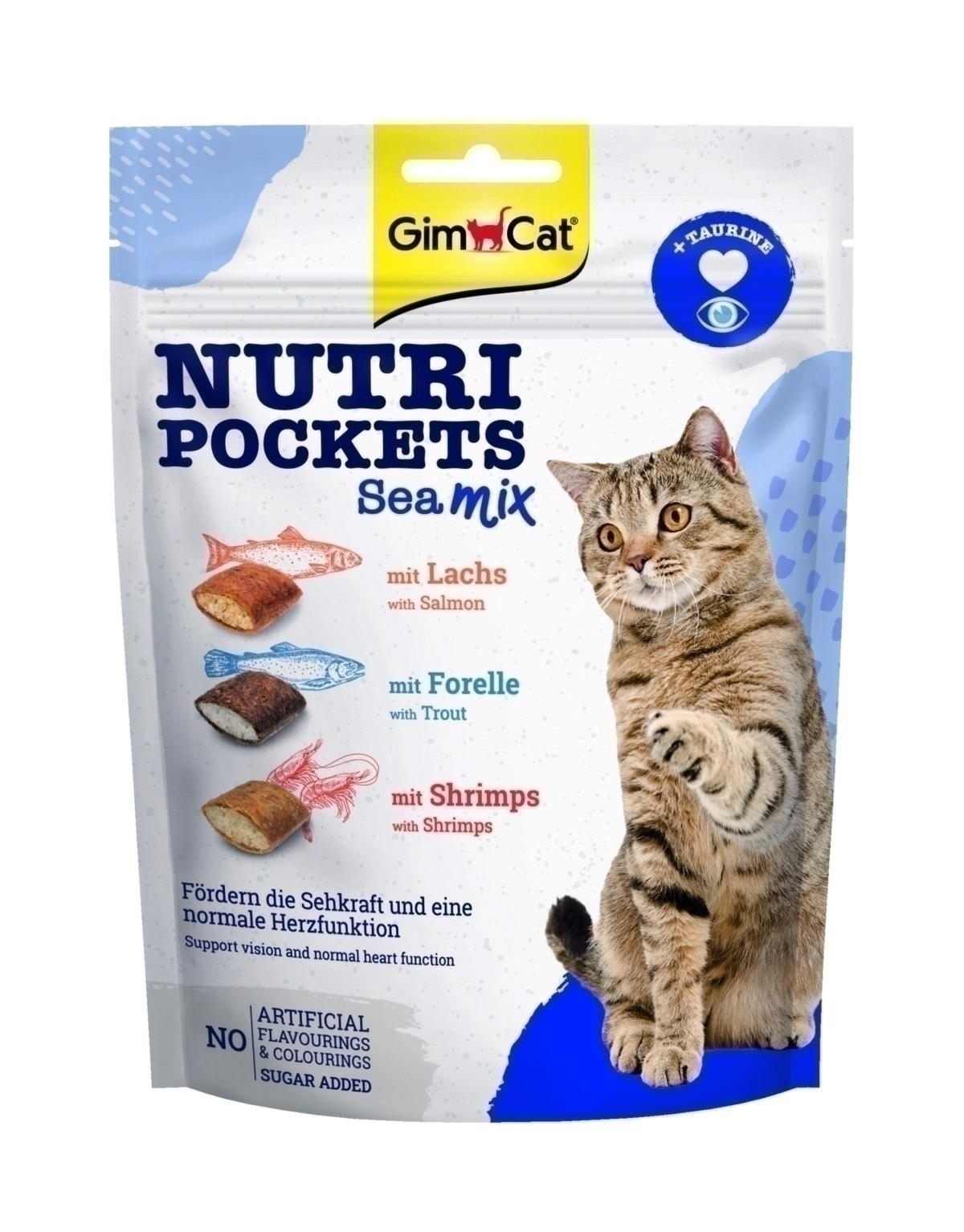 GimCat Nutri Pockets Sea Mix łososiem, pstrągiem i krewetkami miętką to chrupiące smakołyki z wypełnieniem. Są wzbogacone tauryną wspomagającą pracę serca i ważną dla zmysłu wzroku. Karma uzupełniająca dla kotów
