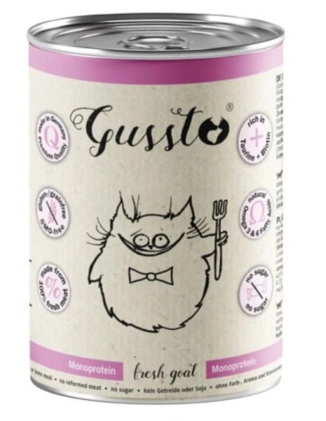 Produkt zawiera dużą ilość mięsa, która idealnie odpowiada specyficznym wymaganiom pokarmowym kotów. Gussto to karma monobiałkowa, a więc holistyczna, lekkostrawna i wyjątkowo dobrze przyswajalna, dzięki czemu polecana jest także dla kotów o wrażliwym przewodzie pokarmowym, w diecie wykluczającej oraz w przypadku alergii pokarmowych. Odpowiednio zbilansowany stosunek wapnia i fosforu pozwala zminimalizować ryzyko chorób nerek i układu moczowego. Dodany olej z ostropestu jest źródłem nienasyconych kwasów tłuszczowych, ma działania przeciwzapalne, reguluje czynności trawienne i regeneracyjne wątroby oraz wzmacnia układ odpornościowy.