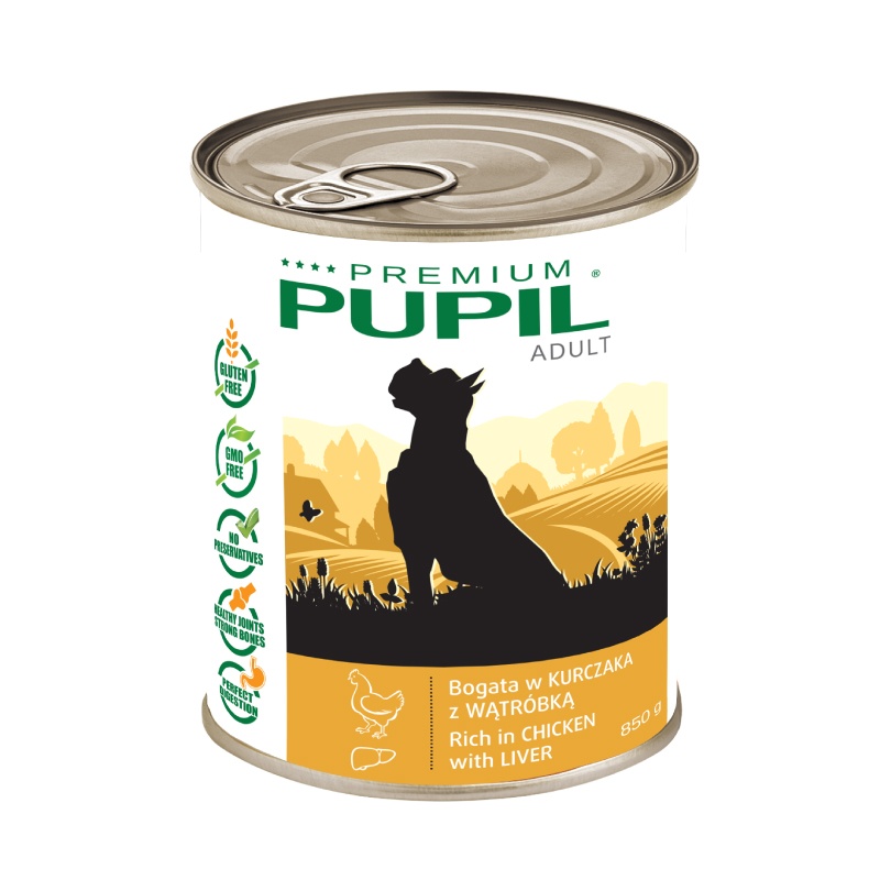PUPIL PREMIUM BOGATA W KURCZAKA Z WĄTRÓBKĄ - PEŁNOPORCJOWA MOKRA KARMA DLA PSA DOROSŁEGO. PRODUKT BOGATY W KURCZAKA Z WĄTRÓBKĄ, W GALARETCE. DLA PSA DOROSŁEGO OD 1 ROKU ŻYCIA.