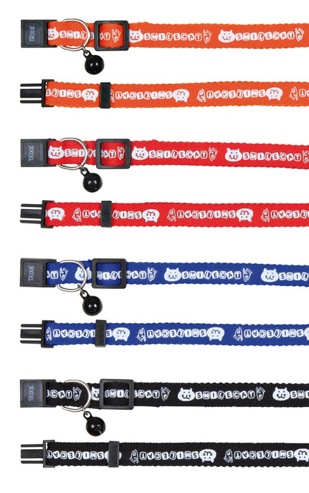 Regulowana, nylonowa obroża dla kotów, pokryta nadrukiem w napisy "Smilleycat" oraz uśmiechnięte kotki.
