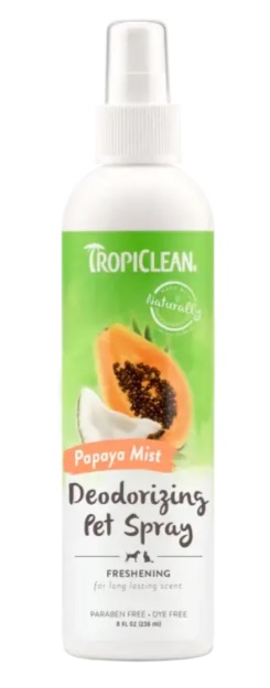 Preparat o zapachu Papai do stosowania bezpośrednio na sierść zwierzęcia oraz elementy wyposażenia mieszkania w celu eliminacji przykrego zapachu. Eliminuje zapach moczu, kału, wydzieliny z gruczołów, wymiocin oraz innych zapachów związanych ze zwierzętami.