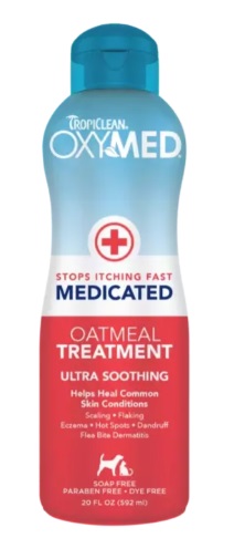TropiClean OxyMed Medicated Treatment to leczniczy szampon z formułą przeciwświądową, stworzony, by łagodzić podrażnioną, swędzącą i suchą skórę u psów i kotów. Zawiera mieszankę alfa-hydroksy, beta-hydroksy i olejek z drzewa herbacianego, które pomagają złuszczyć martwe komórki, oczyścić pory i ukoić stan zapalny. Dzięki owsiance formuła nawilża i poprawia kondycję skóry oraz sierści.