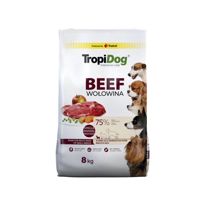 TropiDog Premium Adult SMALL BREEDS – Rich in BEEF to karma Premium bogata w wołowinę dla dorosłych psów małych ras (od 10. miesiąca życia).Kompozycja oparta na jednym źródle białka zwierzęcego przeznaczona jest szczególnie dla psów z wrażliwym układem pokarmowym. Białko wołowe jest łatwo przyswajalne, a dodatek jabłka i marchewki sprzyja poprawie pasażu jelitowego. Zawarte w karmie glony kelp (Ascophyllum nodosum) są natomiast źródłem związków mineralnych (w tym cennego jodu), immunostymulatorów oraz przeciwutleniaczy.