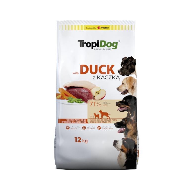 TropiDog Premium Adult MEDIUM & LARGE BREEDS with DUCK to sucha karma dla dorosłych psów średnich ras (od 12. miesiąca życia) i dużych ras (od 15. miesiąca życia).