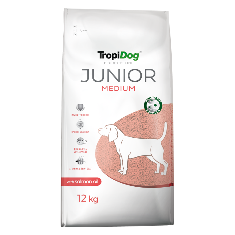 TropiDog Probiotic Line Junior Medium Breeds to pełnoporcjowa sucha karma dla szczeniąt ras średnich, do 12. miesiąca życia. Zawarte w niej składniki każdego dnia wspierają odporność, prawidłowy przebieg trawienia oraz rozwój mózgu młodego psa.