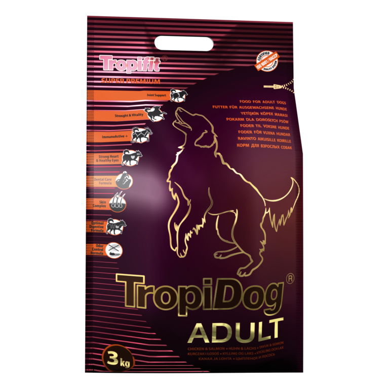 TropiDog Super Premium Adult MEDIUM & LARGE BREEDS CHICKEN & SALMON to wysokiej jakości sucha karma dla psa z kurczakiem i łososiem zapewniająca odżywcze i pełnowartościowe posiłki dla średnich i dużych ras psów.
