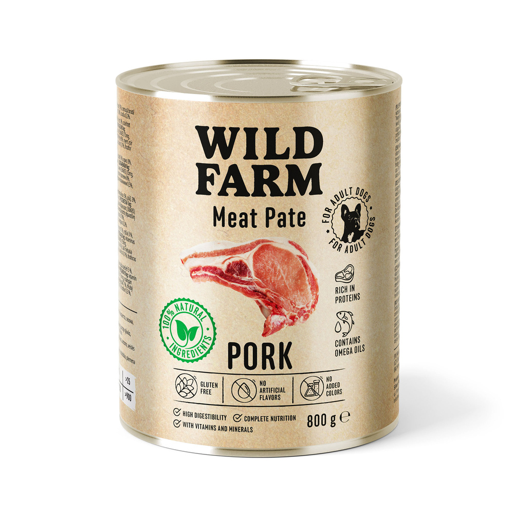 Wild Farm Pate z Wieprzowiną to połączenie tradycji i jakości – mięso wieprzowe (31%), kurczak (21%) i wątroba drobiowa (5%) tworzą bogaty, intensywny