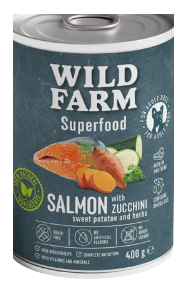 Zanurz się w świecie naturalnego żywienia, w którym każda puszka kryje nie tylko doskonały smak, ale też prawdziwą siłę składników pochodzących prosto z natury. Wild Farm Superfood Salmon with Zucchini, Sweet Potato and Herbs 400g to kompletna mokra karma dla psa, która łączy w sobie wysoką zawartość mięsa z bogactwem warzyw, ziół i superfoods.